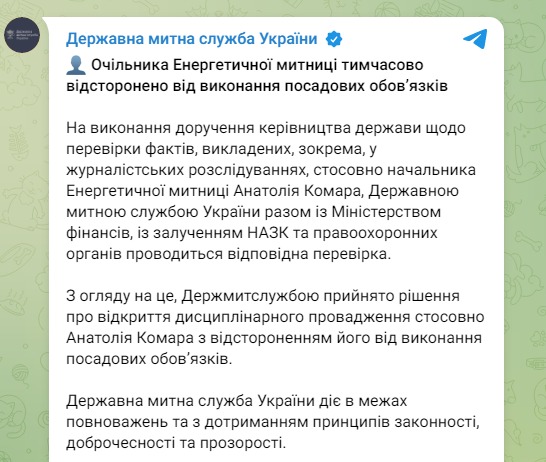 "На виконання доручення керівництва держави щодо перевірки фактів, викладених, зокрема, у журналістських розслідуваннях, щодо начальника Енергетичної митниці Анатолія Комара, Державною митною службою України разом з Міністерством фінансів, із залученням НАЗК та правоохоронних органів проводиться відповідна перевірка. З огляду на це Держмитслужбою прийнято рішення про відкриття дисциплінарного провадження стосовно Анатолія Комара з відстороненням його від виконання посадових обов’язків", - сказано у публікації.
