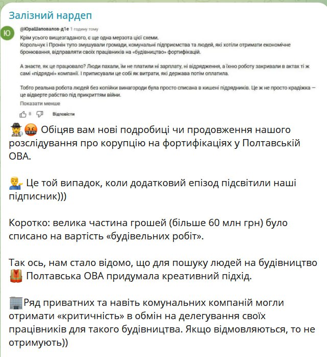 "Для пошуку людей на будівництво Полтавська ОВА вигадала креативний підхід. Ряд приватних і навіть комунальних компаній могли отримати критичність в обмін на делегування своїх працівників для такого будівництва. Якщо відмовляються, то не отримують. У чому схема? Ну тому що гроші на роботи – понад 60 млн грн – списувалися на зовсім інших людей", – розповів Железняк.