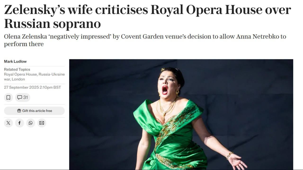 Перша леді України та дружина президента України Володимира Зеленського Олена Зеленська вимагає відмінити виступ російської оперної співачки в Лондонській опері.