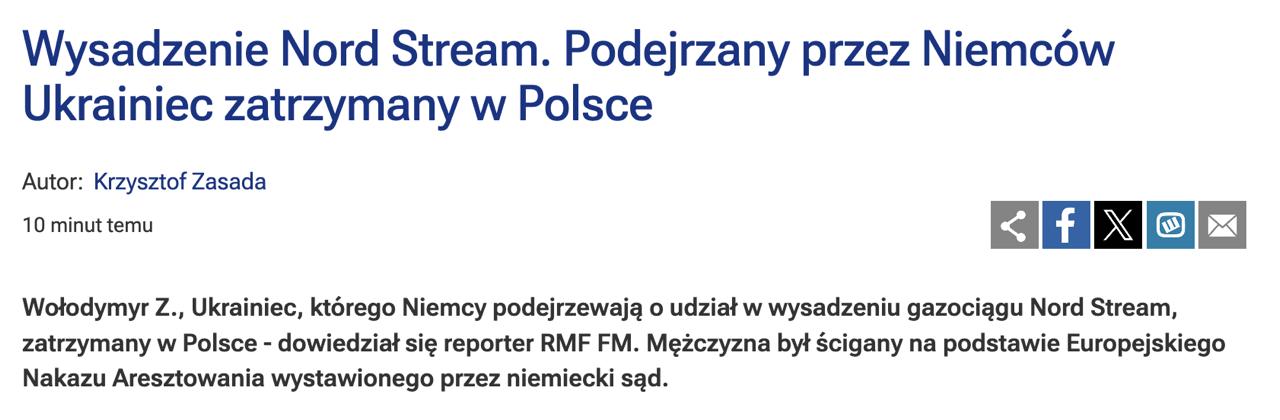 Поліція Польщі затримала у Прушкуві українця Володимира Журавльова, якого правоохоронці Німеччини підозрюють у причетності до підриву ниток газопроводу "Північний потік".
