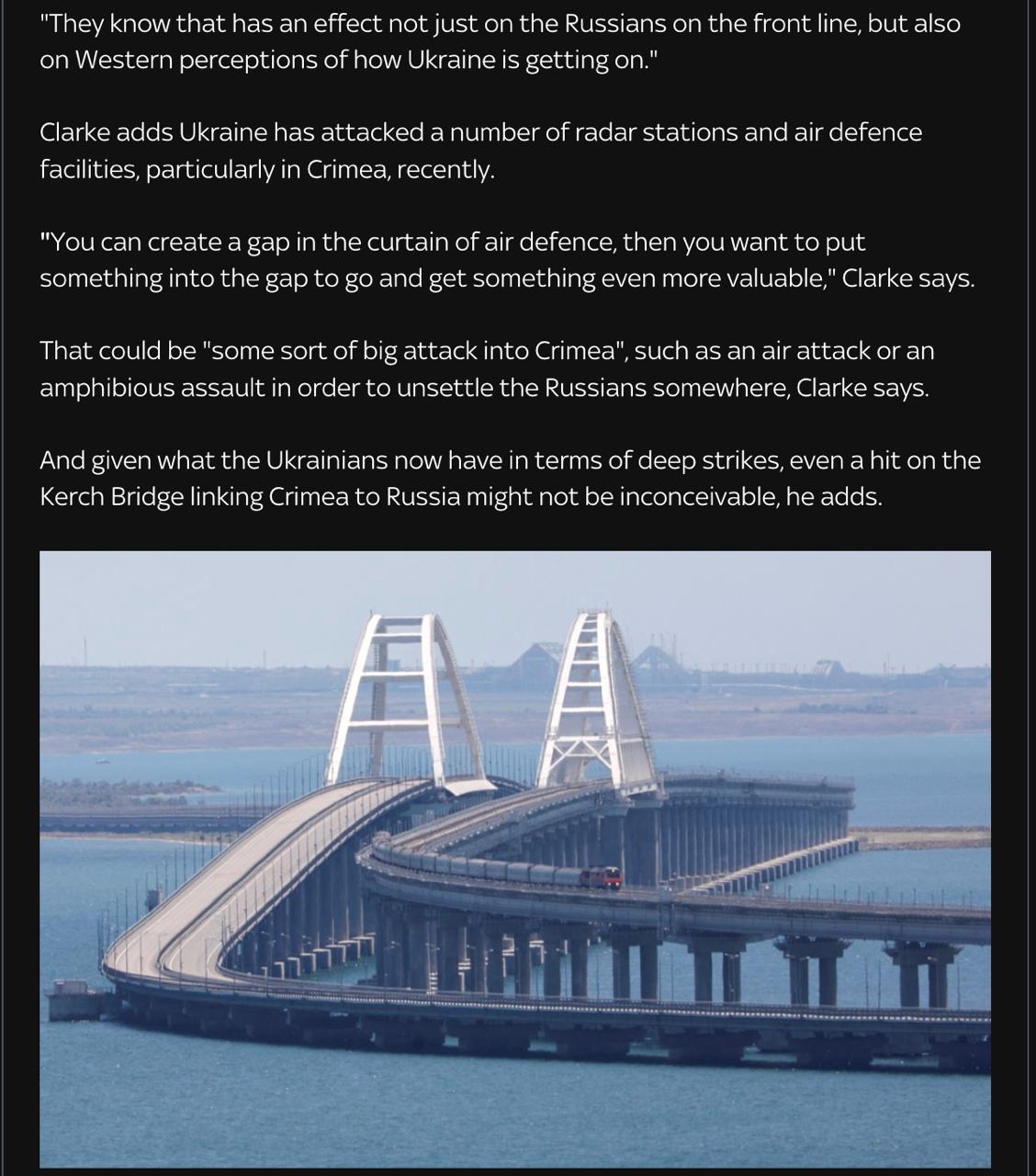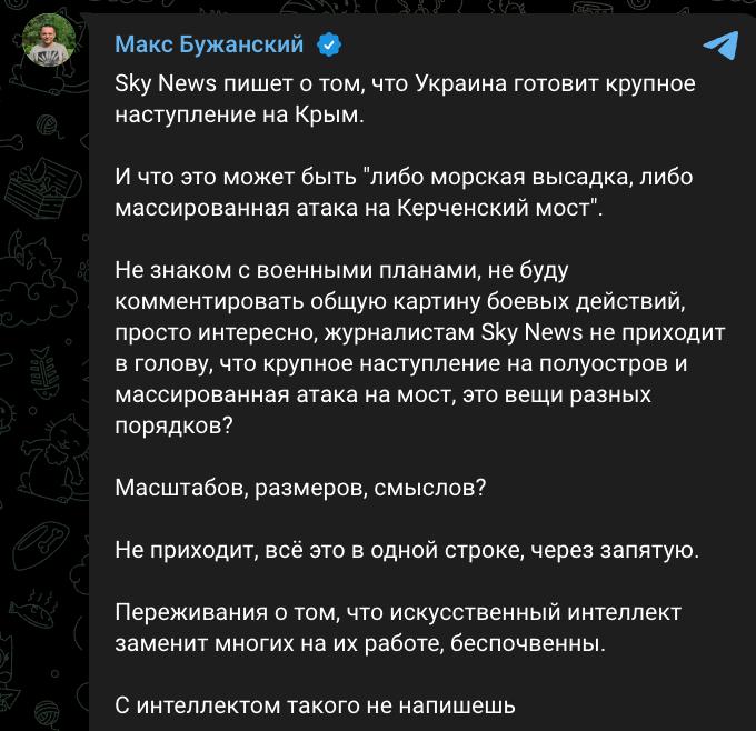 "Sky News пише про те, що Україна готує великий наступ на Крим. І що це може бути "або морська висадка, або масована атака на Керченський міст". Не знайомий з військовими планами, не коментуватиму загальну картину бойових дій, просто цікаво: журналістам Sky News не спадає на думку, що великий наступ на півострів і масований? розмірів, смислів? Не приходить.