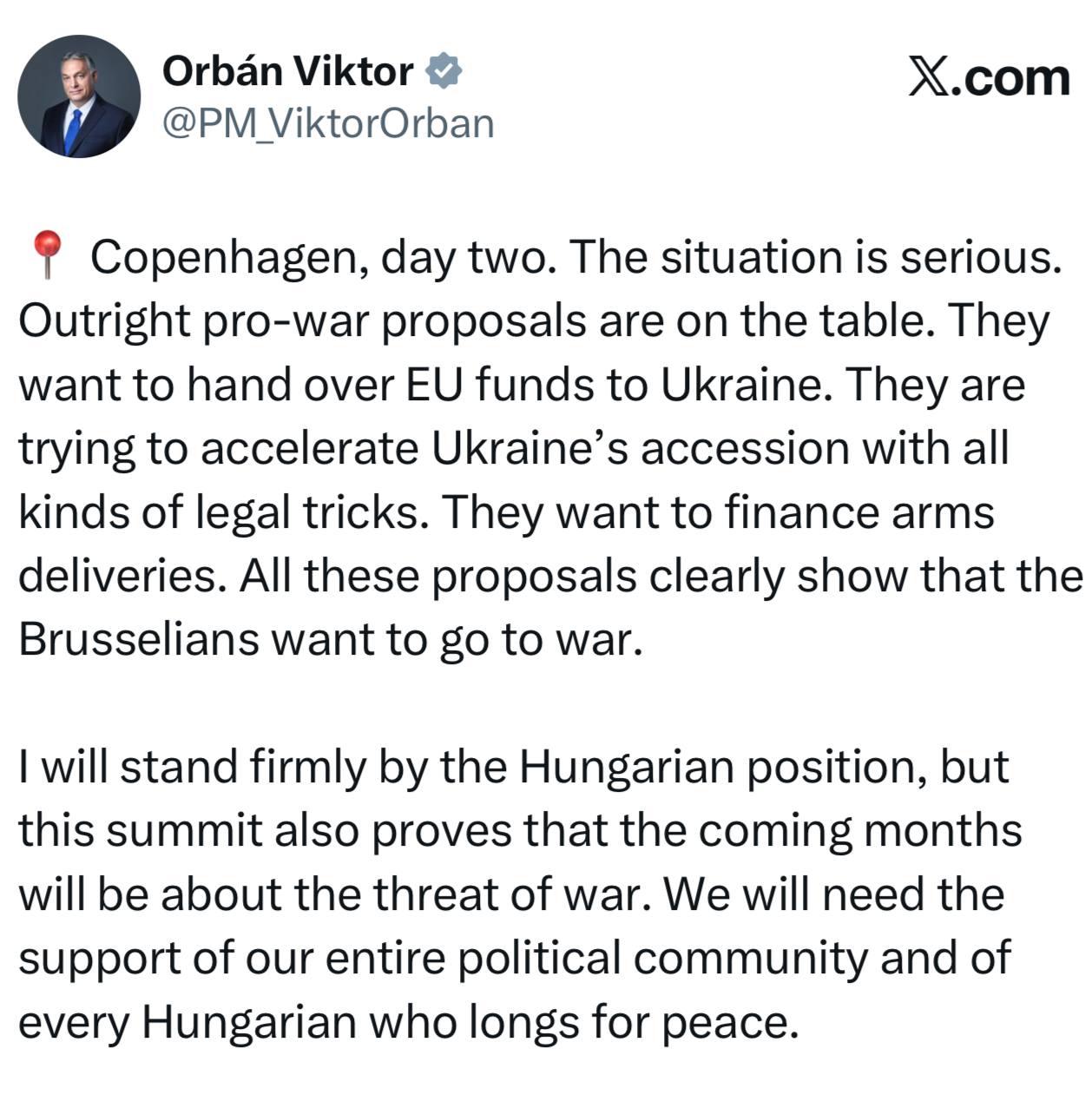 "Ситуація серйозна. На столі переговорів знаходяться відверто провоєнні пропозиції. Вони хочуть передати Україні фонди ЄС. Вони намагаються прискорити вступ України, використовуючи всілякі юридичні хитрощі. Вони хочуть фінансувати постачання зброї. Всі ці пропозиції ясно показують, що брюссельці хочуть почати війну". – написав Орбан.