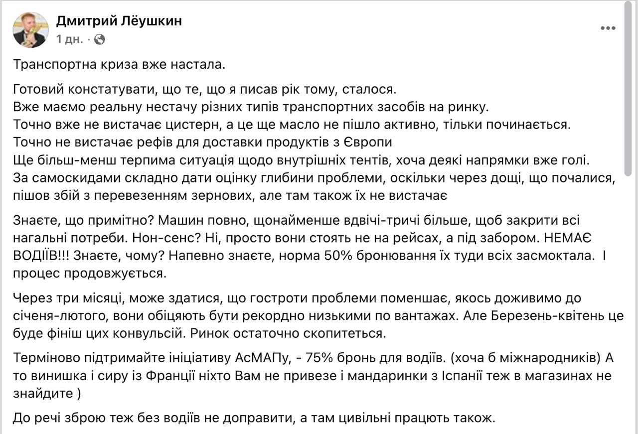 Про це заявив експерт та засновник групи компаній Prime Дмитро Леушкін у Facebook.