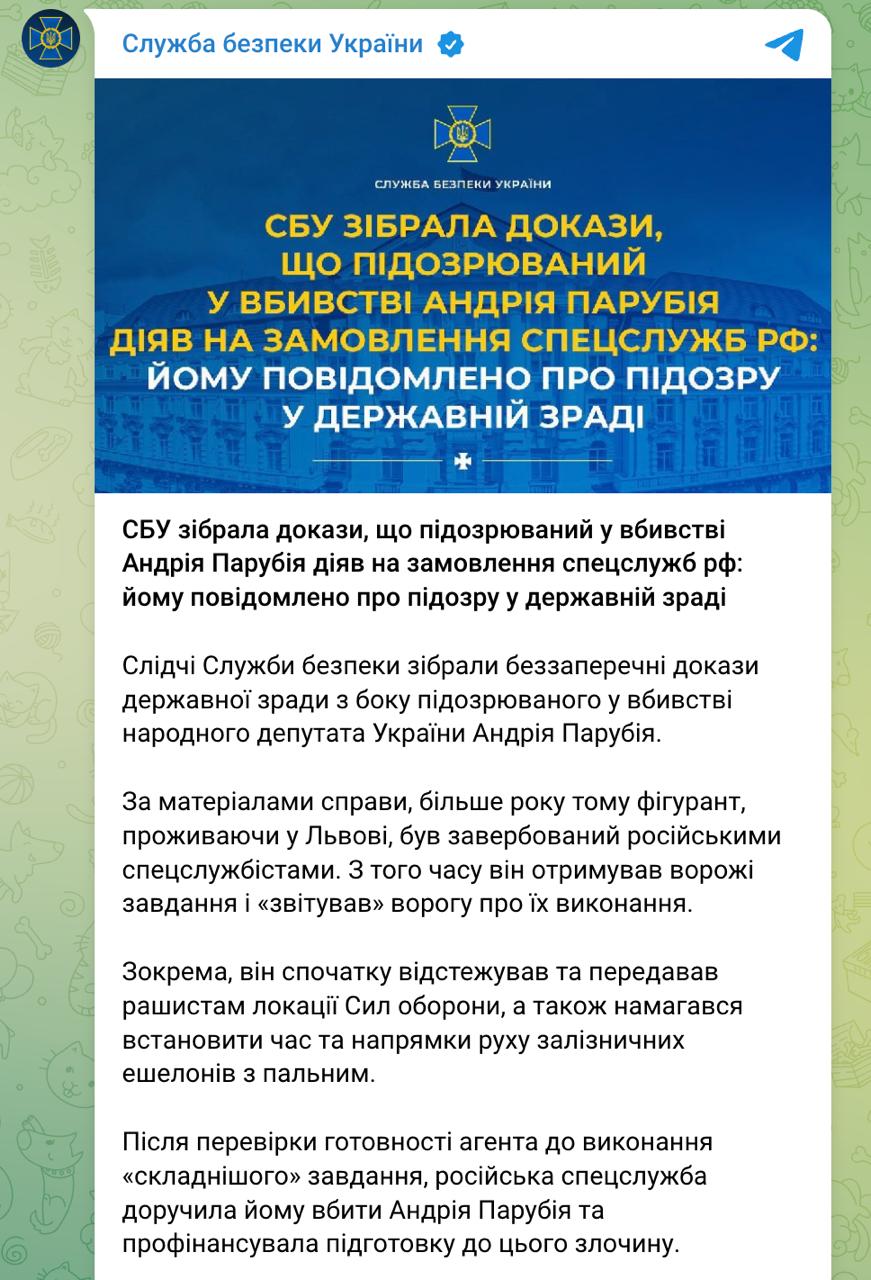 Служба безпеки України заявляє, що зібрала "беззаперечні" докази роботи на РФ підозрюваного у вбивстві екс-спікера Верховної Ради Андрія Парубія.