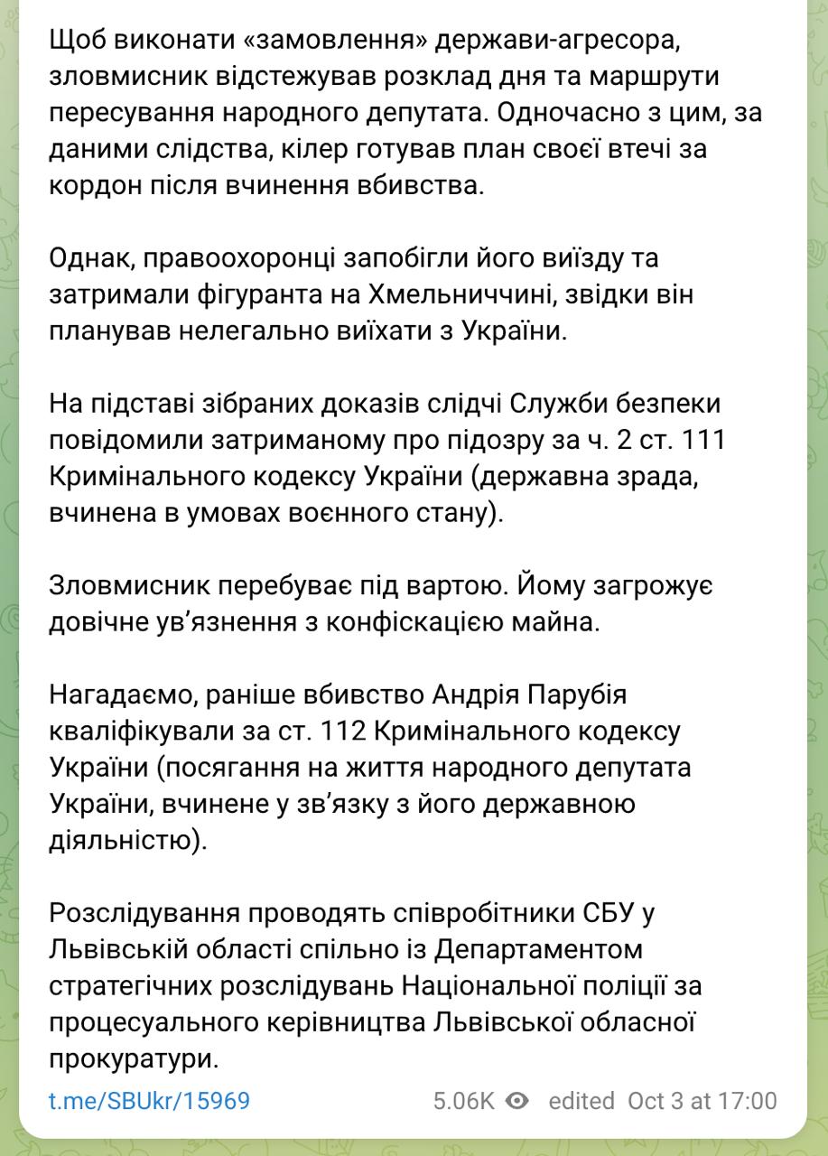 Нагадаємо, сам зловмисник заявляв, що вбив Парубія, щоб "помстити українській владі" за смерть сина під Бахмутом у 2023 році.