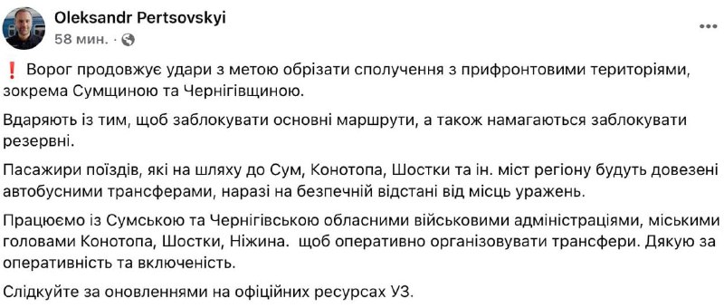 "Ворог продовжує удари з метою обрізати сполучення з прифронтовими територіями, зокрема, Сумщиною та Чернігівщиною. Вдаряють, щоб заблокувати основні маршрути, а також намагаються заблокувати резервні", - вважає Перцовський.