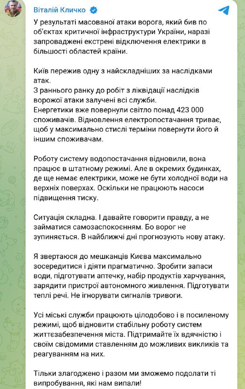 "Я звертаюся до мешканців Києва максимально зосередитися та діяти прагматично. Зробити запаси води, підготувати аптечку, набір продуктів харчування, зарядити пристрої автономного харчування. Підготувати теплі речі. Не ігнорувати сигнали тривоги", - пише столичний мер.