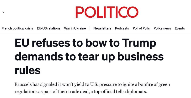 США та Європейський Союз поки не досягли консенсусу щодо тарифної угоди. Президент Сполучених Штатів Дональд Трамп домагається скасування "зелених" правил для американських компаній, а також норм щодо порушення прав людини, а Євросоюз відмовляється.