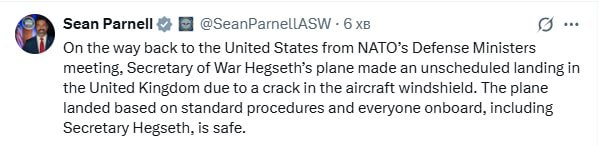 "Літак приземлився відповідно до стандартних процедур, і все на борту, включаючи міністра Хегсета, у безпеці", - написав Парнелл.