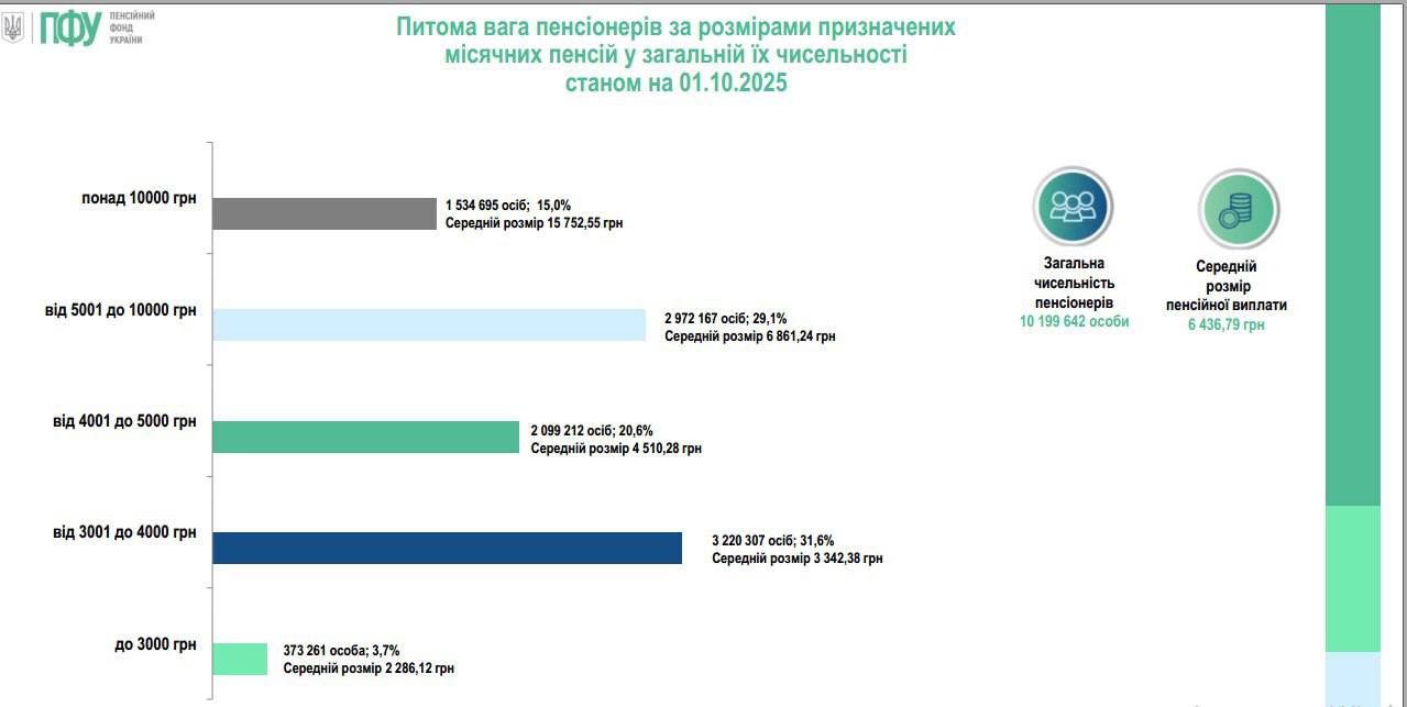 Середня пенсія в Україні станом на 1 жовтня 2025 року становить 6 436 гривень, що близько 155 доларів.