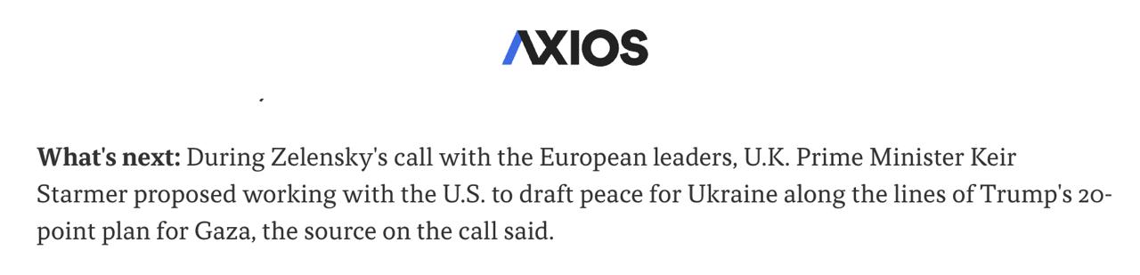 "Стармер запропонував працювати зі США над проектом світу для України відповідно до плану Трампа з 20 пунктів щодо Гази", - пише Axios.