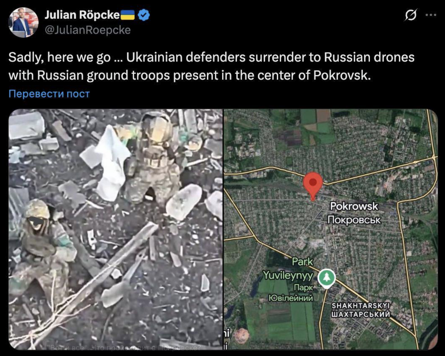 У п'ятницю, 17 жовтня, військовий оглядач Bild заявив, що росіяни вже увійшли до центру Покровська, а їхні дрони беруть у полон українських військових. "Ну, от і все, на жаль", - написав Юліан Репке та опублікував кадр з відео, де солдати ЗСУ стоять на колінах, здаючись у полон.