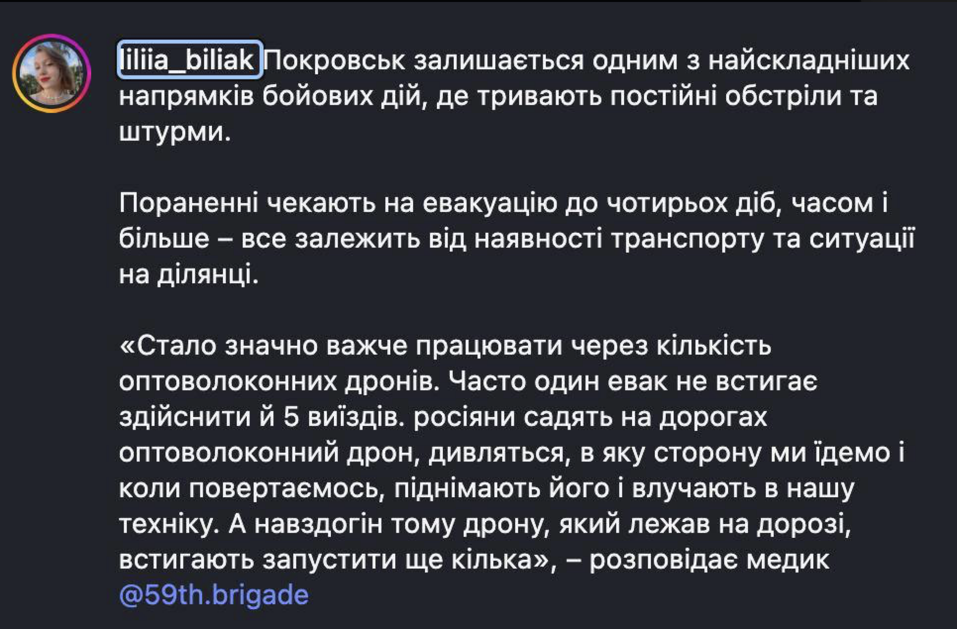 "Стало значно важче працювати через кількість волоконно-оптичних дронів. Часто одна евакуаційна машина не встигає здійснити і п'яти виїздів. Росіяни встановлюють на дорогах оптоволоконний дрон, спостерігають, в якому напрямку ми їдемо і коли повертаємося, піднімають його і вражають нашу техніку. встигають запустити ще кілька", - пише Беляк зі слів медика.