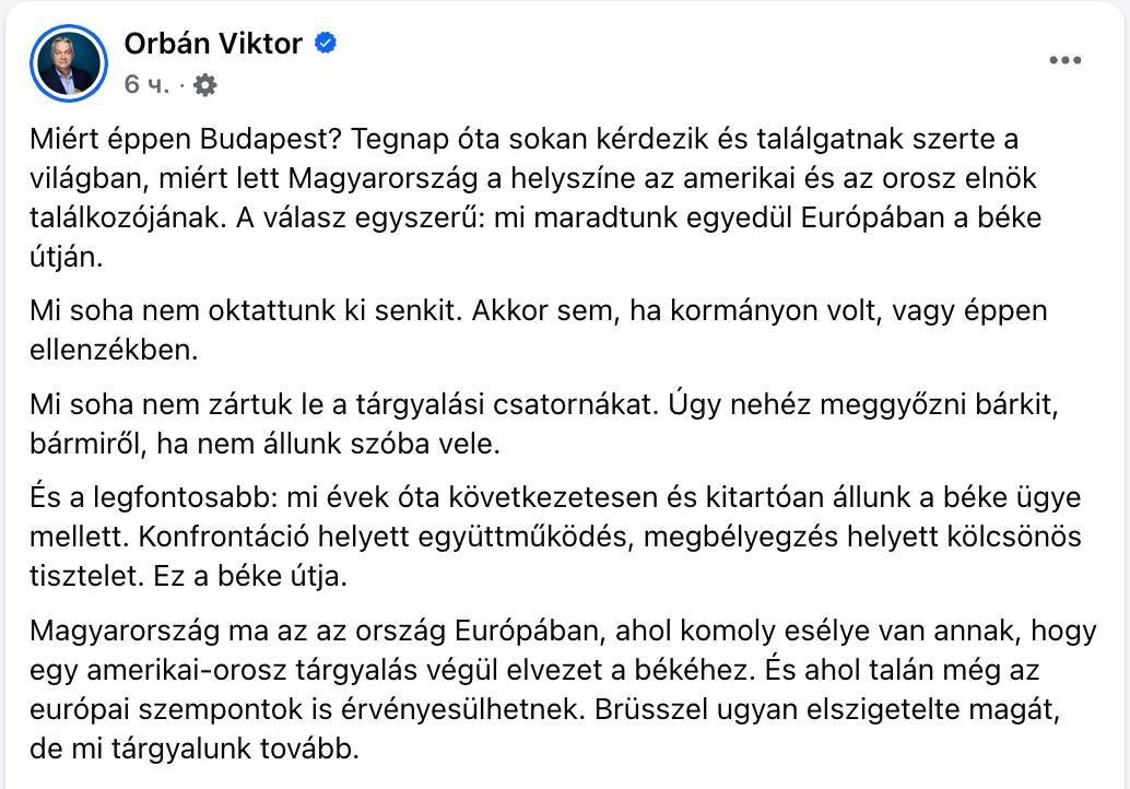 "Важко переконати будь-кого, якщо з ним не розмовляєш. Ми послідовно і наполегливо стоїмо на стороні світу. Замість конфронтації – співпраця, замість таврування – взаємна повага. Це шлях до миру", – пише Орбан.