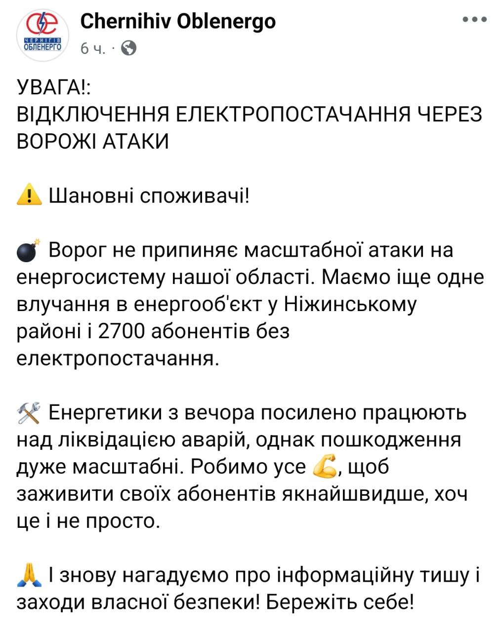 7.49 Під Ніжином був приліт по об'єкту енергетики, "пошкодження дуже масштабні", повідомляє Чернігівське обленерго.
