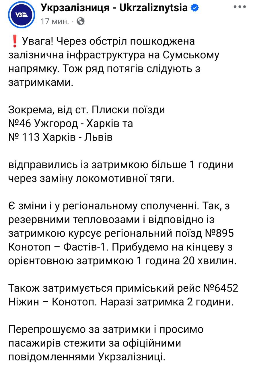 7.56 Через обстріл пошкоджено залізницю на Сумському напрямку, ряд поїздів прямує із затримками.