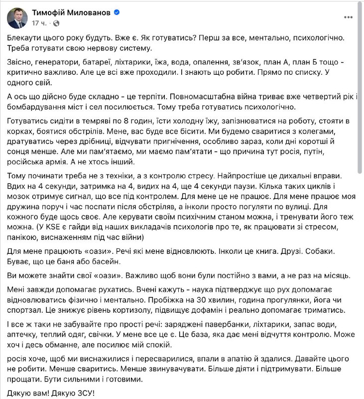 "Блекаути цього року будуть. Вже є. Як готуватися? Насамперед ментально, психологічно. Потрібно готувати свою нервову систему. Звичайно, генератори, батареї, ліхтарики, їжа, вода, опалення, зв'язок, план А, план Б і т.д. - критично важливо. дихальні вправи. Вдих на 4 секунди, затримка на 4, видих на 4, ще 4 секунди паузи. Декілька таких циклів - і мозок отримує сигнал, що все під контролем", - написав екс-міністр.