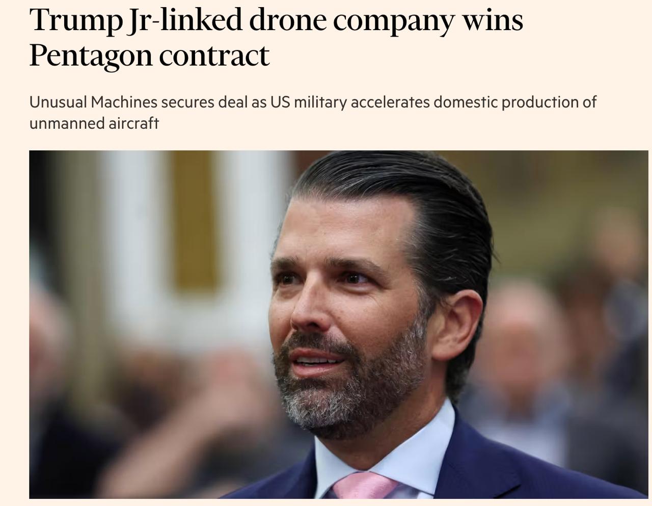 У публікації йдеться, що маловідоме американське підприємство з Флориди, в якій син президента США володіє активами приблизно на чотири мільйони доларів, взялося виробити 3500 двигунів для дронів та інші деталі. Армія США також заявила про намір замовити Unusual Machines ще 20 тисяч компонентів для БпЛА наступного року.