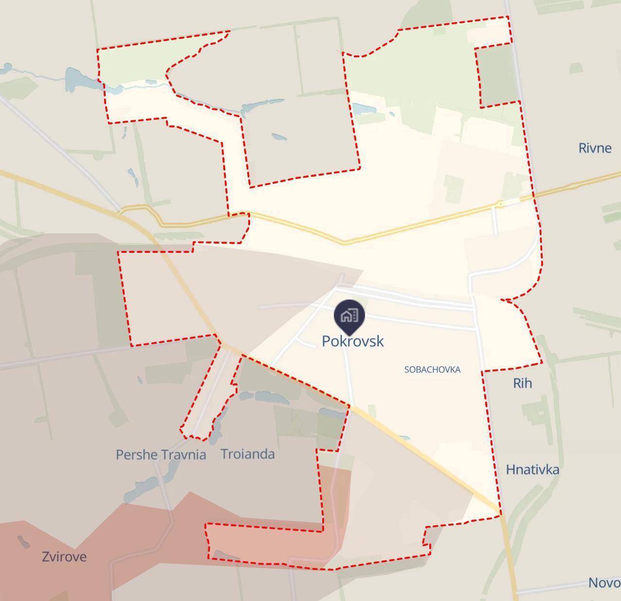 На карті українського паблика мікрорайон Собачівка у Покровську позначений під українським контролем, хоча бійці ЗСУ пишуть, що його майже повністю захоплено. І якщо так, то навіть за консервативними оцінками Deep State сіра зона охопила всю основну частину міської забудови Покровська.