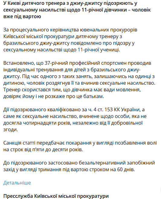 Тренеру оголосили про підозру за ч. 4 ст. 153 КК України (сексуальне насильство, вчинене стосовно особи, яка не досягла чотирнадцяти років, незалежно від її добровільної згоди).