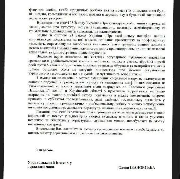 "Водночас слід зазначити, що ситуація регулярного публічного виконання громадянами російськомовних пісень у публічних місцях в умовах збройної агресії Росії проти України обґрунтовано викликає громадське обурення та неприйняття, яке я повністю поділяю. Хоча ця ситуація знаходиться поза регулюванням українського законодавства, вона суспільно чутлива та конфліктна", - написала Івановська.