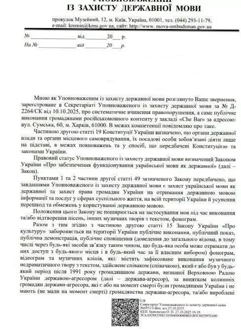 Уповноважена із захисту державної мови Олена Івановська закликала поліцію провести "профілактично-роз'яснювальну роботу" у закладі Che Bar, що на вулиці Сумській у центрі Харкова, де відвідувачі регулярно співають російськомовні пісні.