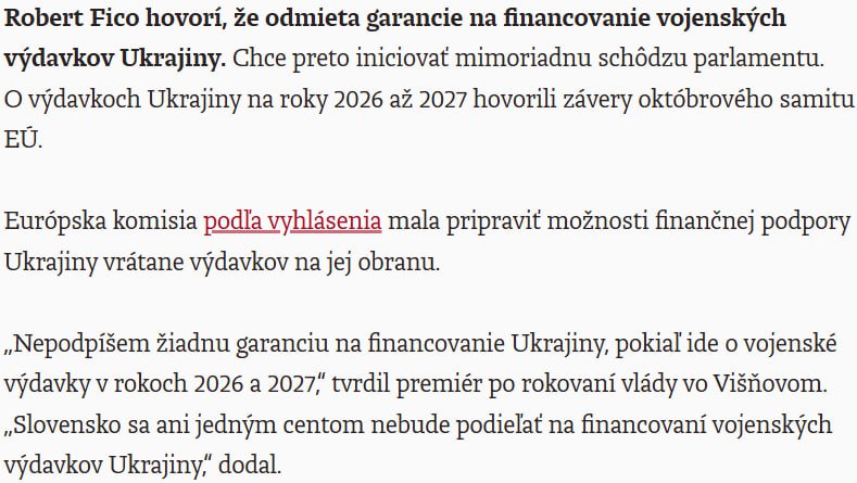 "Я не підпишу жодної гарантії щодо фінансування України, що стосується військових витрат у 2026 та 2027 роках. Словаччина жодним центом не братиме участі у фінансуванні військових витрат України", - сказав Фіцо.