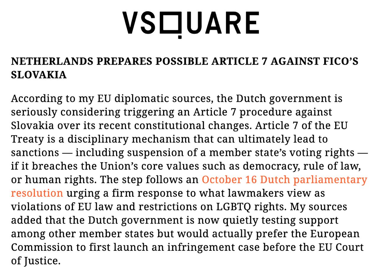 За даними VSquare, нідерландський уряд зараз неофіційними каналами з'ясовує, чи готові інші країни ЄС підтримати цю ініціативу. Причому, Нідерланди хочуть, щоб перший крок у покаранні Словаччини зробила Європейська комісія, ініціювавши в Суді ЄС справу про порушення.