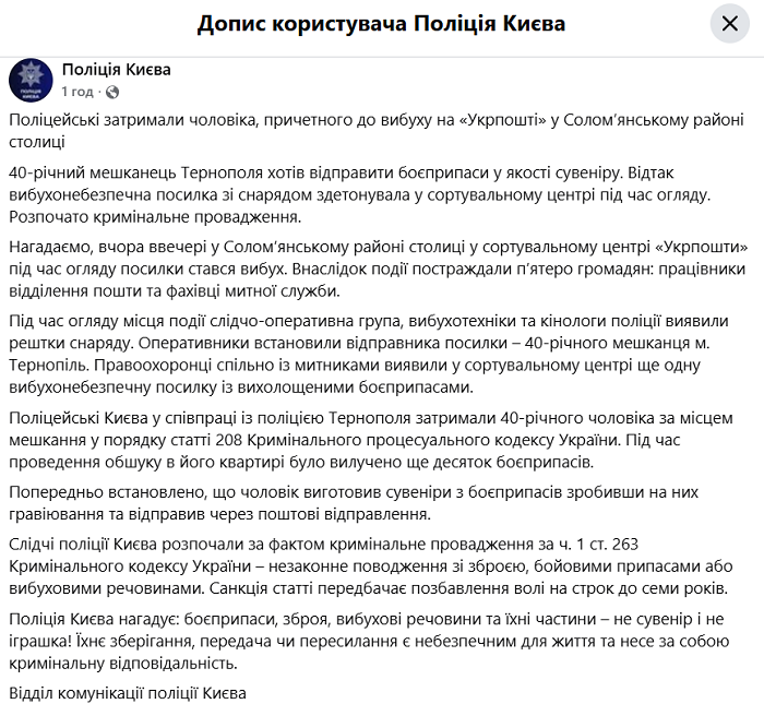 Робив сувеніри із боєприпасів. У Києві затримали відправника посилки, що вибухнула