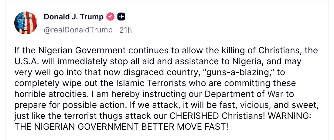 Трамп заявив, що США можуть припинити допомогу Нігерії і "вирушити в цю країну, що зганьбилася, щоб повністю стерти з лиця землі ісламістських терористів", якщо напади на християн не припиняться.