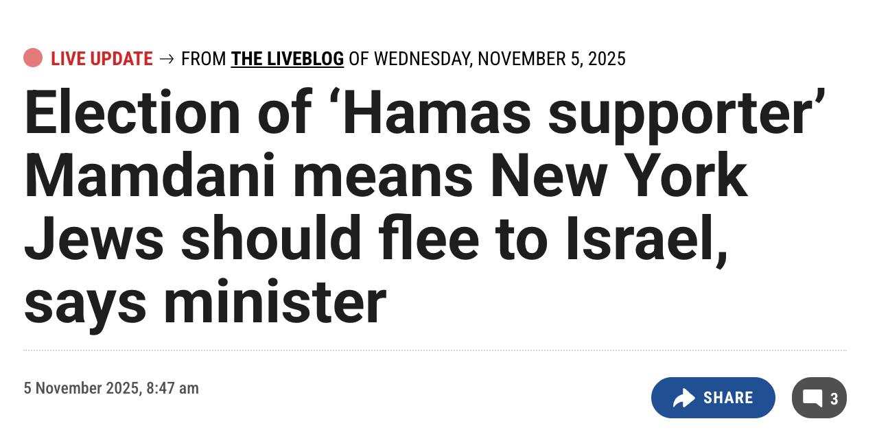 Міністр у справах діаспори Ізраїлю Аміхай Шіклі закликав євреїв Нью-Йорка залишити місто через обрання мером мусульманина-демократа Зохран Мамдані, якого він звинуватив у підтримці ХАМАС.