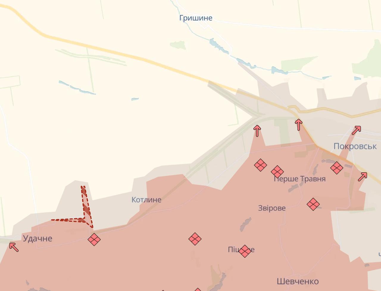 Армія РФ різко просунулась до Мирнограда, що біля Покровська, і біля Вдалого у напрямку траси на Павлоград, повідомляє Deep State.