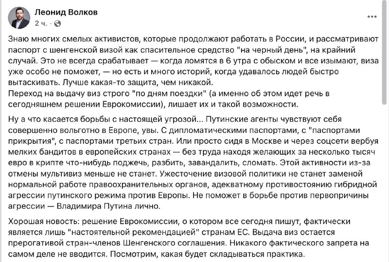 "Що стосується боротьби з справжньою загрозою... Путінські агенти почуваються абсолютно вільно в Європі, на жаль. З дипломатичними паспортами, з "паспортами прикриття", з паспортами третіх країн. Або просто сидячи в Москві і через соцмережі вербуючи дрібних бандитів в європейських країнах - легко знаходячи бажаючих за кілька тисяч євро, Цієї активності через скасування мультивіз менше не стане", - вважає Волков.
