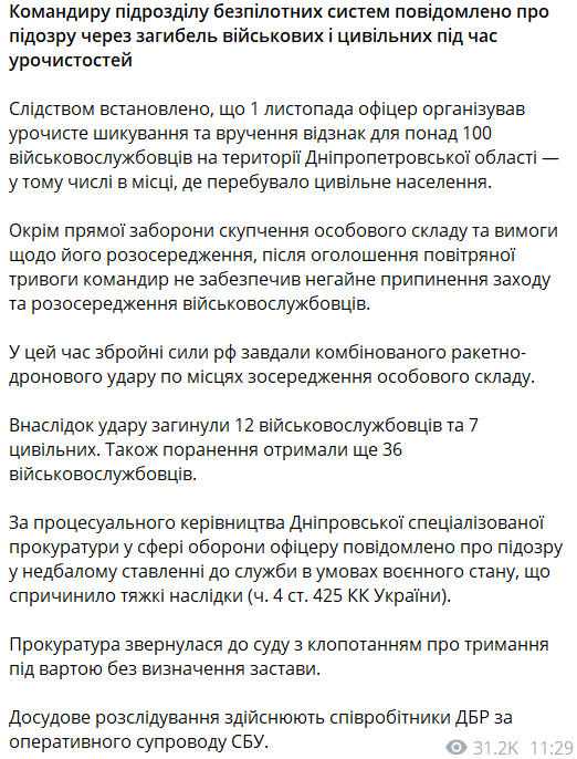 Як повідомили в Офісі Генпрокурора, "після оголошення повітряної тривоги командир не забезпечив негайного припинення заходу та розосередження військовослужбовців".