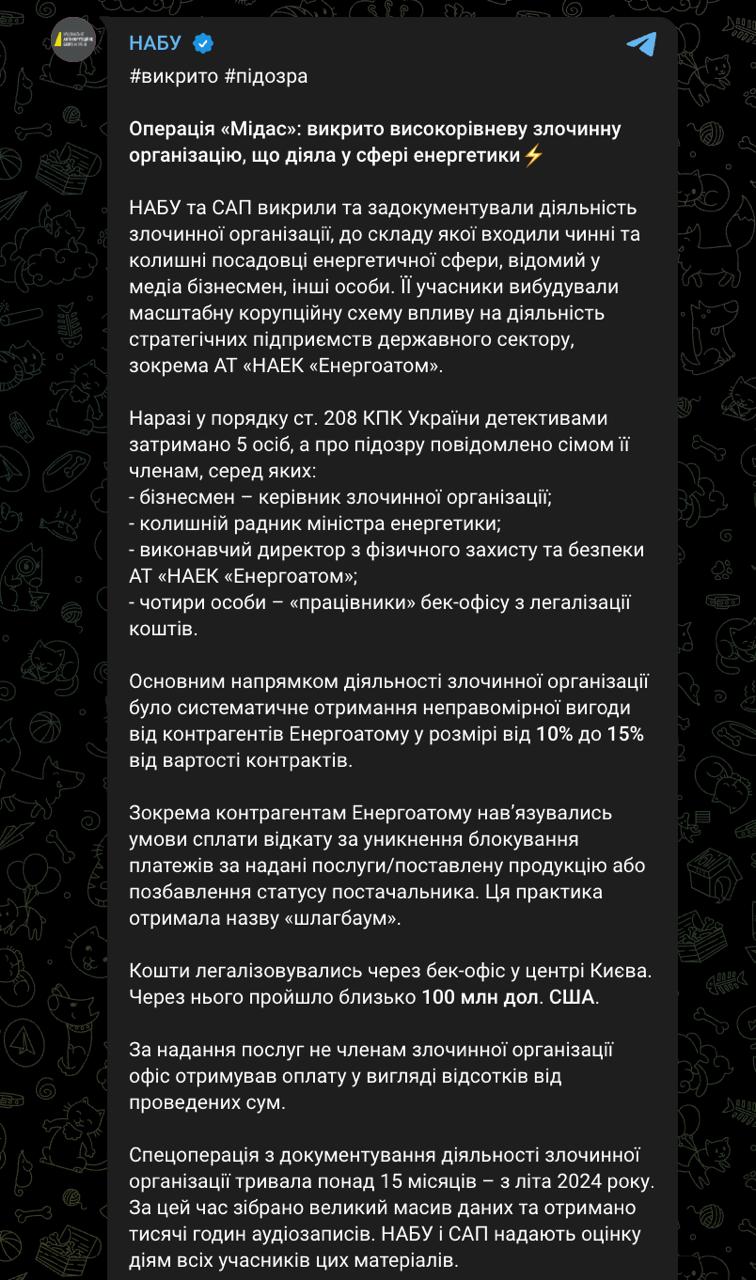 Тим часом детективи НАБУ затримали п'ятьох осіб та повідомили про підозру семи учасників злочинної організації. Серед них - бізнесмен, який керував схемою, колишній радник міністра енергетики, топ-менеджер "Енергоатому" та четверо співробітників так званого бек-офісу з відмивання грошей.