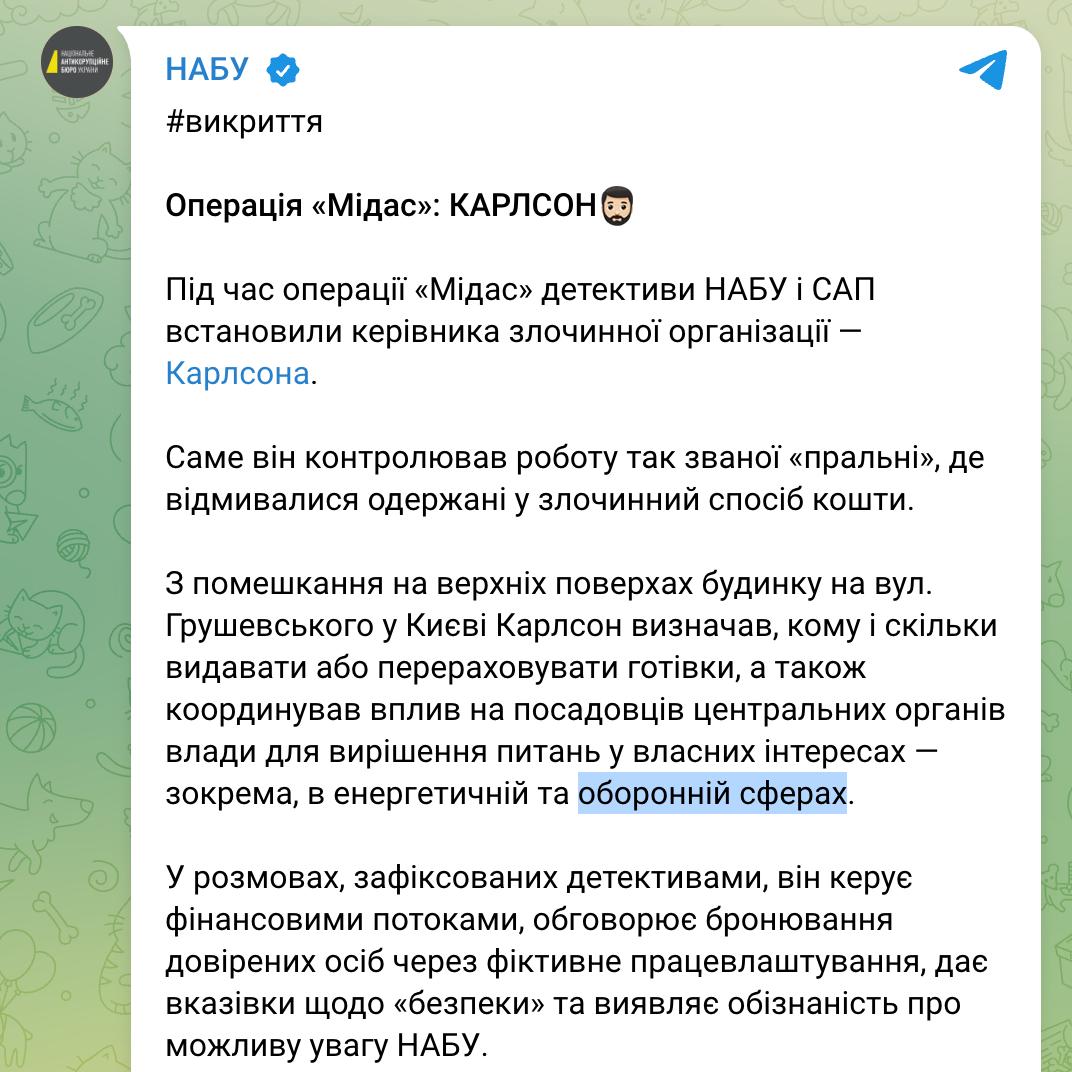 У відомстві наголосили, що саме Карлсон курирував діяльність так званої пральні, через яку відмивалися гроші, отримані злочинним шляхом. За даними слідства, на записах переговорів він керує фінансовими потоками, обговорює фіктивне працевлаштування довірених осіб, дає вказівки з питань безпеки та виявляє поінформованість про можливий інтерес НАБУ.