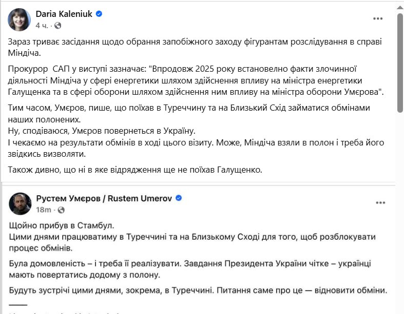 "Зараз йде засідання щодо обрання запобіжного заходу фігурантам розслідування у справі Міндіча. Прокурор САП у виступі зазначає: "Протягом 2025 року встановлено факти злочинної діяльності Міндіча у сфері енергетики шляхом впливу на міністра енергетики Галущенка та у сфері оборони шляхом здійснення ним впливу на міністра оборони. Туреччину і на Близький Схід займатиметься обмінами наших полонених. Ну, сподіваюся, Умеров повернеться в Україну.