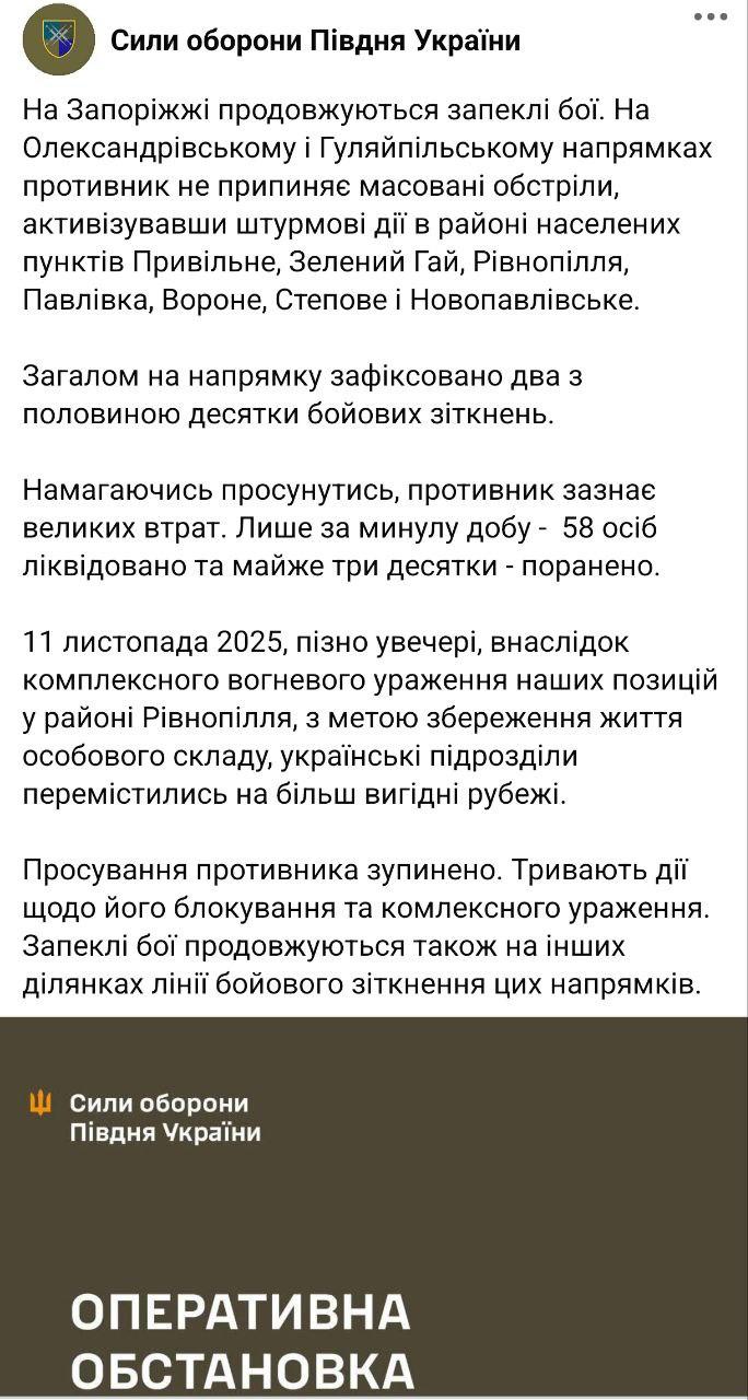 "Після заняття Рівного відкривається оперативний простір руху на Гуляйполі з півночі, проте противник може зосередитися на ширших завданнях, адже ресурсів для Гуляйполя поки що у росіян немає. Тому зараз може продовжуватися рух у напрямку Варварівки і зосередитися на пілотах, щоб ускладнювати логи Гуляйполя, щоб послаблювати здібності тримати оборону", – пише паблік.