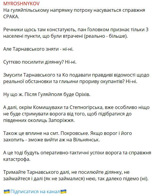 "Після Гуляйполя буде Оріхів. А далі, окрім Камишевахи та Степногірська, вже особливо ніщо не буде стримувати ворога від того, щоб підібратися до південних околиць Запоріжжя. Це також вплине на смт Покровське. Якщо ворог і його захопить, зможе вийти аж на Вільнянськ. А це тоді на оперативні, а це тоді на Вольнянськ. А це тоді на Вольнянськ." вважає Мірошніков.