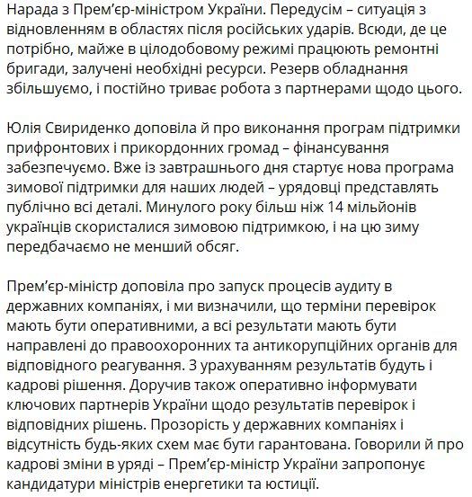 Про це повідомив президент України Володимир Зеленський за підсумками наради з прем'єр-міністром Юлією Свириденком у своєму телеграм-каналі.