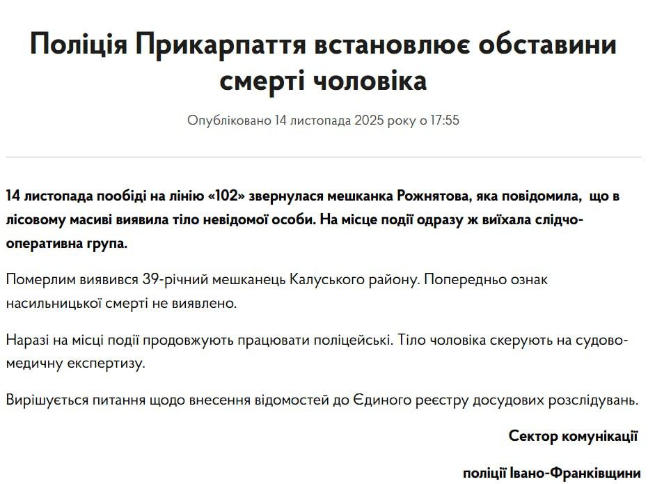 У лісі під Івано-Франківськом знайшли тіло чоловіка, який напередодні був мобілізований. Труп було знайдено у районі Рожнятова під Калушем.