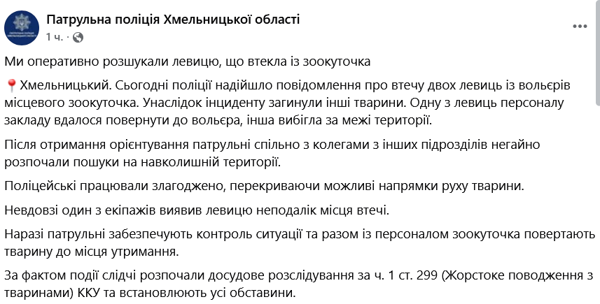 За словами директора установи Сергія Палехіна, хтось зламав замки на дверях вольєра і тварини втекли. Одну з двох левиць знайшли швидко. За словами Палехіна, весь цей час вона знаходилася поряд із зоокуточком і далеко не йшла.