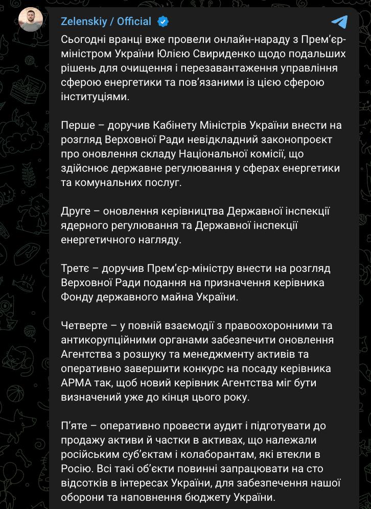 "П'яте - оперативно провести аудит і підготувати до продажу активи та частки в активах, що належать російським суб'єктам та колабораціоністам, які бігли до Росії. Усі такі об'єкти мають працювати на сто відсотків на користь України, забезпечуючи нашу оборону та поповнення бюджету країни", - пише Зеленський.