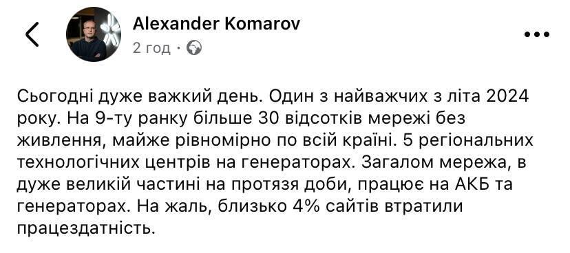 "Сьогодні дуже важкий день. Один з найважчих з літа 2024 року. На 9 ранку більше 30% мережі без живлення, майже рівномірно по всій країні. 5 регіональних технологічних центрів на генераторах. Загалом мережа в дуже великій частині протягом доби працює на АКБ (акумуляторних батареях - Ред. ), і генераторах." пише Комаров.