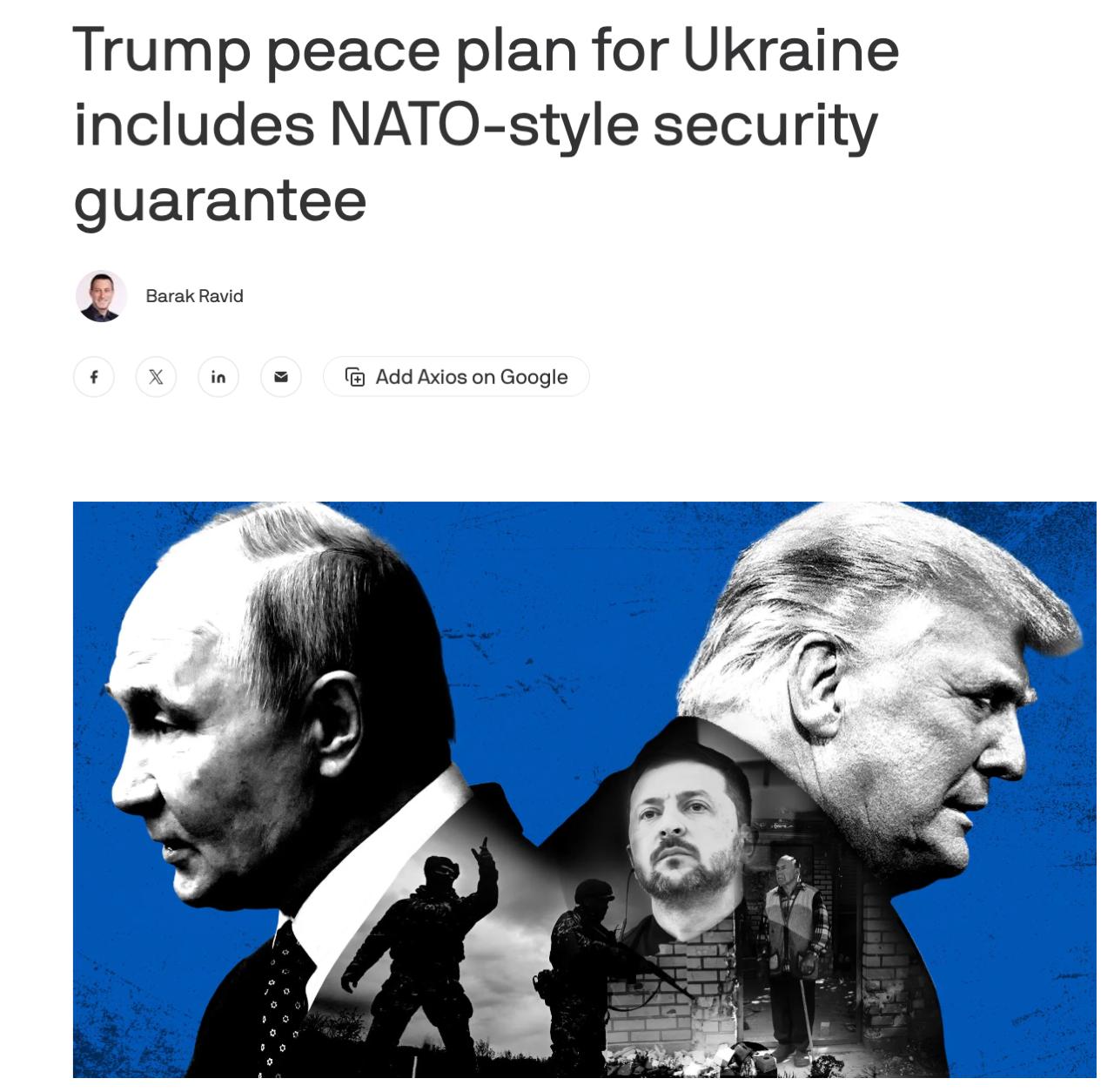 А видання Axios розповіло, що мирний план включає гарантії безпеки, які ґрунтуються на статті 5 договору про НАТО.
