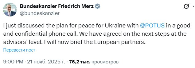 "Я щойно обговорив план миру для України з президентом США у добрій та конфіденційній телефонній розмові". Ми домовилися про подальші кроки на рівні радників. Я зараз проінформую європейських партнерів", – написав німецький канцлер.