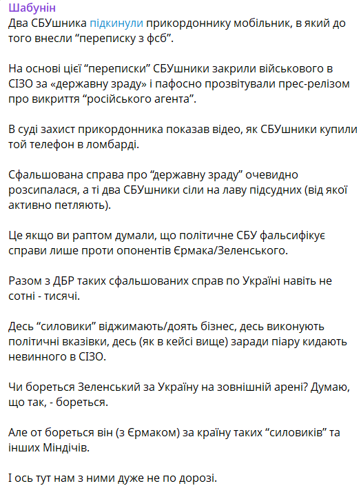 "Десь силовики віджимають/доять бізнес, десь виконують політичні вказівки, десь (як у кейсі вище) заради піару кидають невинного у СІЗО", - написав Шабунін.