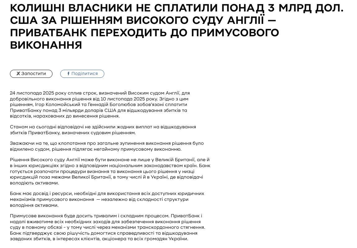 "ПриватБанк і надалі вживатиме всіх необхідних заходів для забезпечення виконання рішення суду в повному обсязі - у тому числі через механізми транскордонного стягнення", - йдеться у повідомленні.