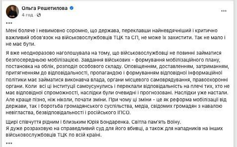 Про це заявила військова омбудсмен Ольга Решетилова після вбивства співробітника ТЦК у Львові.
