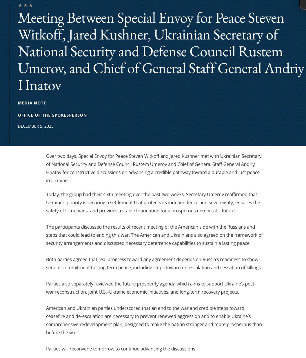 Аналогічну заяву опублікував і голова української делегації Рустем Умеров за підсумками зустрічі зі спецпредставниками США Стівеном Віткоффом і Джаредом Кушнером.